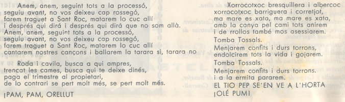 La versió original acabava amb uns compassos de l’anomenat «himne de l’Exposició de 1909» o «himne regional»: «pas a la regió que avança en marxa triomfal». Seguint el suggeriment de Manuel Segarra Ribés, el compositor va canviar el final, que acaba amb un fragment d’una cançó popular valenciana, «el tio Pep se’n va a l’horta», que Garcia va rematar amb l’«Olé, pum».