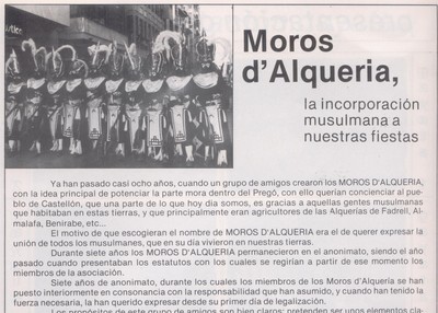 L'Associació Cultural “Moros d’Alqueria” va néixer de les inquietuds d'un grup de joves castellonencs als quals es va unir des del principi un alcoià establert a Castelló; Jorge Vitoria, amb el propòsit de dignificar la participació de “els moros” en el Grup Història del Pregó. Tot això ocorria a partir del mes de maig de 1975, Toni Peris, Manuel Llopis, Juan Antonio Llopis, juntament amb Jorge, en el domicili de la família Colón-Navarro, van ser els que van gestar la idea. Més endavant es van afegir al grup Salvador Molina, José Ramón Navarro o Emilio Fito entre altres.